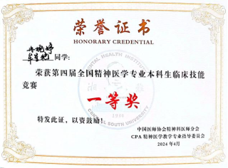 经过激烈角逐,我校精神医学本科生团队(指导老师:彭娟、王智、姜栩恒、魏志杰,学生:牟星艳、冉婉婷)凭借卓越的临床技能、扎实的理论功底和出色的团队协助精神,成功斩获一等奖,由中南大学湘雅二医院精神病学科系主任,中南大学精神卫生研究所所长王小平教授颁奖。