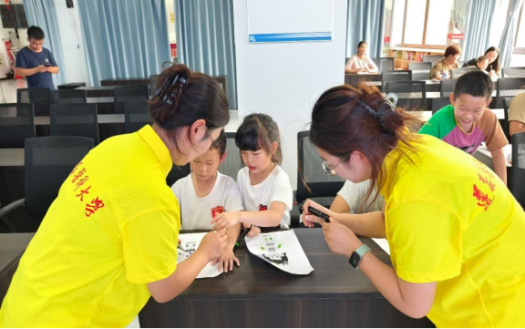 一路“童”行伴成长,文化传承永不忘。7月18日8:30,实践队以甲骨文为钥,开启了一场穿越时空的文化盛宴。团总支同学曾意以“日”“月”“山”“水”等生动实例,揭秘甲骨文的造字奥秘与独特韵味,引领小朋友们遨游于古老文字的海洋。现场互动热烈,孩子们的好奇心与探索欲被点燃,为中华优秀传统文化的传承播下希望的种子。