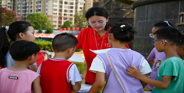“推普+志愿服务”,聚焦重点推普人群。实践队设计制作具有推普Logo和推普特色标语的“推普帽”“帆布包”“学习手册”等物品,将群众日常生活必需品融于深度推普工作,以乡村帮扶志愿服务巩固推普工作,切实发挥推普在儿童、老年人等重点人群中的潜移默化作用。推普学习手册集普通话基础、正安农特产品特色介绍于一体,内容贴近实际,提升普通话推广受众对当地特色产品的品牌价值认同感。在吉他广场,实践队员通过“诵读古诗”“识汉字”“我问你答”等挑战知识难关的方式,引导小朋友们积极感悟、体验、传承中华优秀传统语言文化,参与的小朋友们兴致满满、争先恐后。