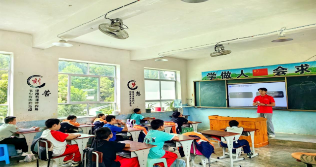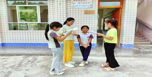 “推普+知识常识”,增强安全保护意识。在“推普之家”流渡镇百花村白石小学,推普实践队张贴“推普+安全”宣传标语,积极营造民族共同语推广使用氛围。在校园图书角,队员积极引导小学生阅读书籍经典文章片段,并对小朋友们的语言疑惑耐心答疑。队员深入课堂,结合自身亲自经历的案例素材向小学生们讲解校园霸凌预防、青少年生理生长以及人体器官和急救等日常知识。小朋友们热情洋溢、活泼昂扬,时而与实践队员交流、互动和提问,争先主动中充满了困惑好奇……实践队员耐心详细地交流、沟通和答疑。