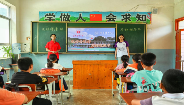 “推普+专题培训”,提升语言使用能力。推普实践队与南京理工大学常青藤支教队相互配合,联合开展“说好普通话 写好规范字”专题讲课。队员们通过课堂小游戏等喜闻乐见的方式激发小学生们说普通话、讲规范字的浓厚兴趣,寓教于乐,绕口令、诗词朗诵、书法小比赛等推普内容层出不穷……小朋友积极主动参与、踊跃互动。一幅幅字迹略带生涩的书法作品、一阵阵响亮的诗词朗诵声,营造出浓厚的普通话推广使用氛围,乡村小学生们学习汉语言文字的认真踏实精神在推普课堂上展现得淋漓尽致。