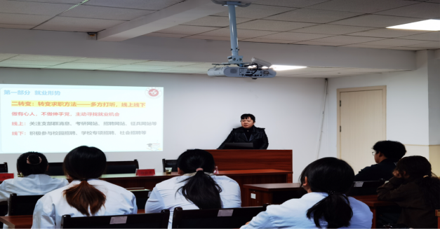 就业办主任孙会英针对毕业生就业难题,向实习生深刻分析了当前就业形势、就业政策、就业程序,引导学生提升就业竞争力,做到三早三转变——早布局、早准备、早行动、转变就业观念、转变求职方法、转变求职身份,为毕业生就业提供了专业指导。