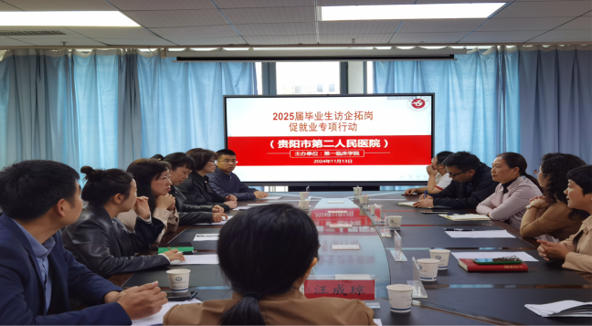 为积极应对当前就业形势,拓宽毕业生就业渠道,进一步推动2025届毕业生就业工作,2024年11月13日-14日学院党委副书记杨洪艳带队就业办、学生科、教务科及毕业年级辅导员前往贵阳市第二人民医院、黔西南州人民医院、兴义市人民医院、安顺市人民医院、贵航302医院开展2025届毕业生访企拓岗促就业专项行动,实习基地相关负责人、全体实习学生参加。