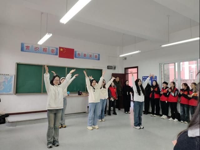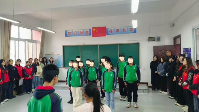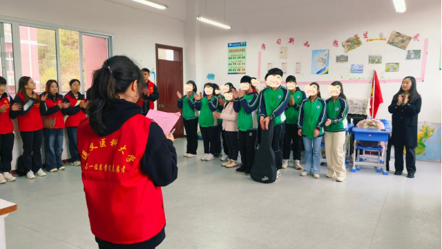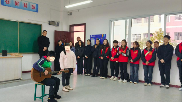 特殊教育学校的小朋友为志愿者们表演了精心准备的诗朗诵和吟诵。11名特殊教育学校的学生身着绿色校服声情并茂的朗诵,昂首挺胸的身姿、铿锵有力的声音,表达对世界的热爱与对未来的憧憬。而《长征七律》的吟诵,女孩纯净嗓音与男孩吉他旋律交织在一起,直击人心,让志愿者们在旋律中感受他们用音乐点亮的璀璨星空。随后2022级第二团总支的同学们给大家带来了《你笑起来真好看》歌唱表演,温暖的旋律和真挚的歌词,传递着积极向上的生活态度,让所有志愿者和孩子们情不自禁地一起合唱,将气氛推至高潮,纯真的笑声与欢快的音乐交织,整个教室被温暖的气息包裹。