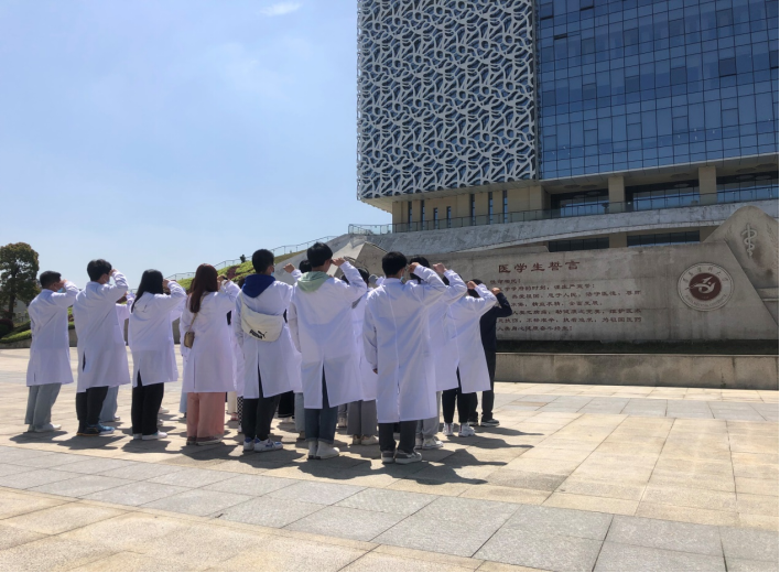 “医学生宣誓”。支部老师带领同学们来到图书馆门口的医学生誓言旁,同学们庄严地举起右手并宣誓“健康所系,性命所托……”,通过一句句庄严的医学生誓言,表达了遵医学子愿为祖国的医疗卫生事业奉献自己青春和热血的承诺。