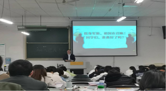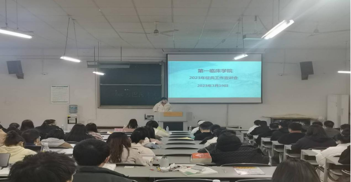 国防教育,强军卫国。2023年3月19日19:00,学院在大连路校区二阶教室举行了2023年春季学期征兵工作宣讲会,附属医院保卫科副科长、退伍军人杨华,学校武装部禹倩老师分别作了军营生活经历的分享和应征入伍政策的解读,学院党委副书记杨洪艳、辅导员尹君和毕业生180余名同学参会。通过此次宣讲,进一步提升我院师生的国防意识,鼓励了毕业班学生积极应征入伍、到军营建功立业、报效祖国。会后,临床18-9班黄益鑫等同学联系辅导员和宣讲老师,表示有参军意愿。