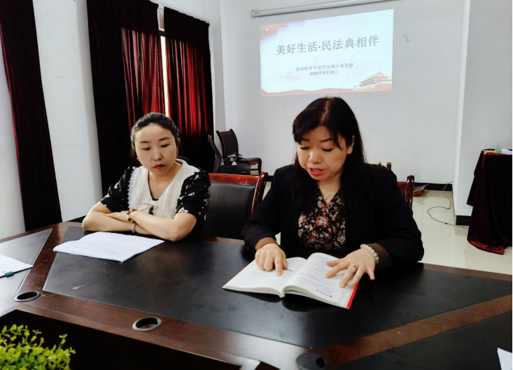 为深入切实做好《民法典》学习宣传贯彻工作,大力弘扬民法精神,普及民法知识,形成全民尊法、学法、守法、用法的良好氛围,让《民法典》学习宣传深入人心,2023年5月19日12:30,必赢线路检测3003no1临床医学专业学生第十党支部在新蒲校区支部党员活动室开展了“美好生活·民法典相伴”主题宣传教育活动。党委副书记杨洪艳、学生科科长姚华敏、支部书记孔晓冬、辅导员谢雪艳参会并领学,支部全体学生干部参会。