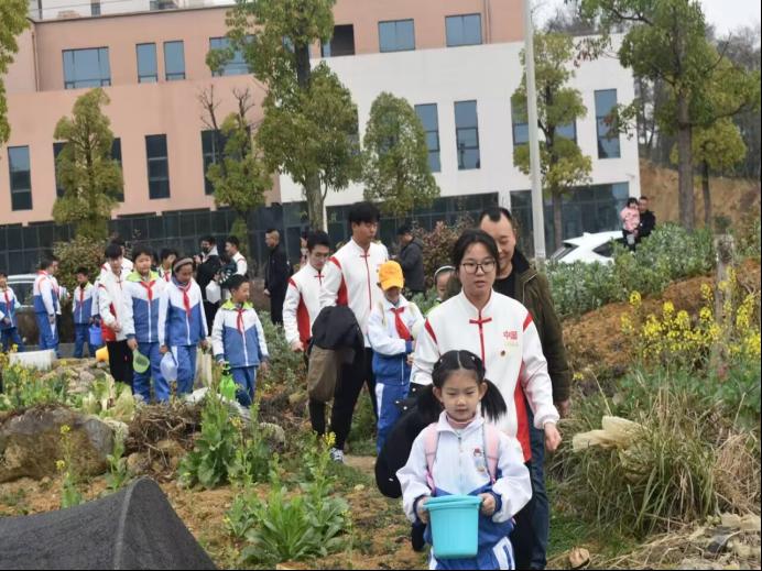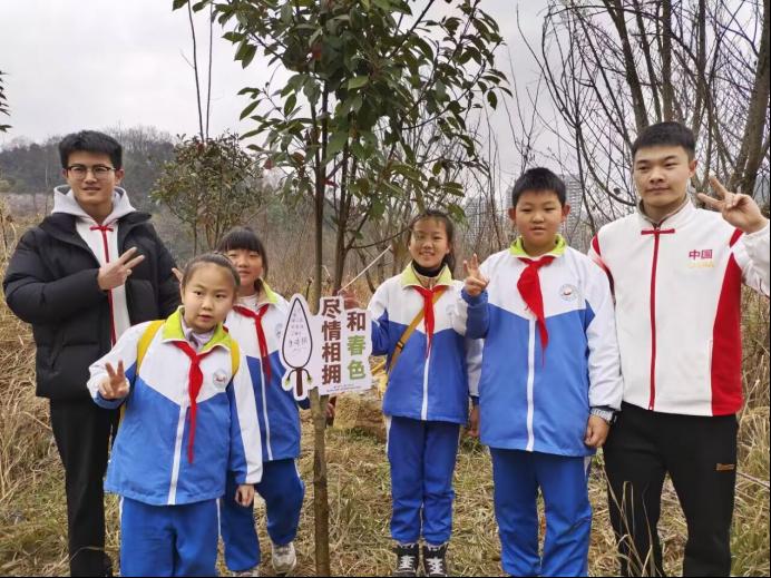活动伊始,第九党支部学生代表钟愉灵同学为本次联合活动致辞,说明了活动目的、活动流程、注意事项等。致辞完毕后,第九党支部学生钟愉灵、罗兰兰向在场的师生们宣讲森林防火相关知识,生动认真的讲解让大家收获满满。随后,第九党支部的学生们带领着小荷中队的同学们开始植树,并将写着美好祝愿的心愿牌挂在了种下的小树上。除了共同植树以外,第九党支部的大学生哥哥姐姐们还专门组织了植树节的知识竞答小游戏,小荷中队的同学们踊跃参与,热情高涨。