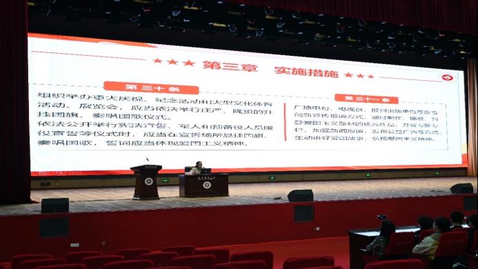 王东红以什么是爱国主义、爱国的基本要求有哪些两个问题开篇,引经据典,以岳飞精忠报国、林则徐虎门销烟两则故事引入“爱国”主题。接着带领同学们一起全文学习《中华人民共和国爱国主义教育法》,包涵《中华人民共和国爱国主义教育法》的立法经过、制定意义等。她重点向同学们解读了《中华人民共和国爱国主义教育法》中第一章第六条关于爱国主义教育的主要内容(共9条)以及关于国旗、国徽、国歌、《中华人民共和国英雄烈士保护法》的内容。最后,王东红告知同学们:爱国就是要爱祖国的大好河山;爱自己的骨肉同胞;爱祖国的灿烂文化;爱自己的国家。因为有国才有家,“家是最小国,国是千万家”。
