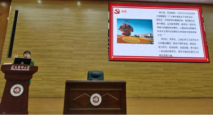 杨洪艳分别从党的二十大召开的背景及意义、党的二十大报告的主要内容、学习贯彻党的二十大精神三个方面展开讲述。她首先带领大家简要回顾党的二十大召开的基本情况、背景及意义。然后分别从奋斗新时代、贯彻新思想、擘画新蓝图、启航新征程四个部分对党的二十大报告的主要内容进行讲解。最后围绕如何深入学习贯彻党的二十大精神进行阐述,教育和引导同学们要牢记中国共产党人的初心和使命,用习近平新时代中国特色社会主义思想武装头脑,不断提高个人的思想意识、学习本领和工作能力,恪守和践行医学生誓词,为祖国医药卫生事业的发展和人类身心健康而奋斗。