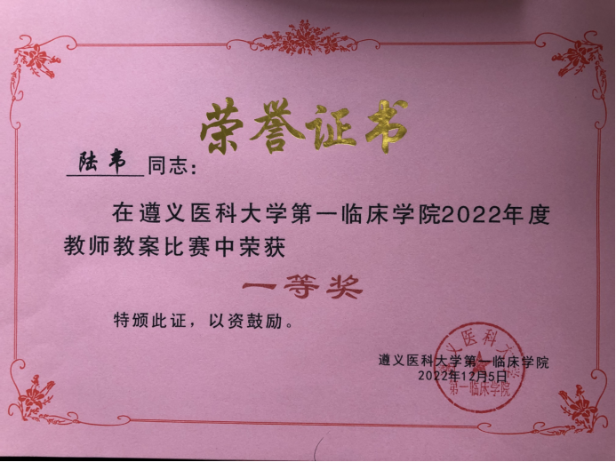 祝贺我院陆韦教授在我院2022年度教师教案比赛中获“一等奖”!