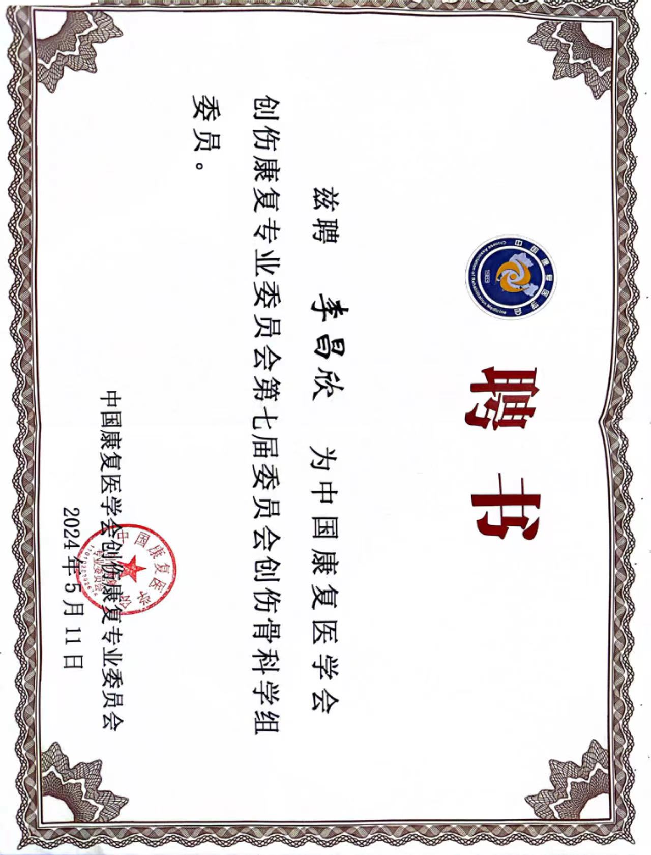 2024年5月11日,在海南省海口市举办中国康复医学会创伤康复专业委员换届会议,我教研室李昌欣博士成为中国康复医学会创伤康复专业委员会创伤骨科学组委员。