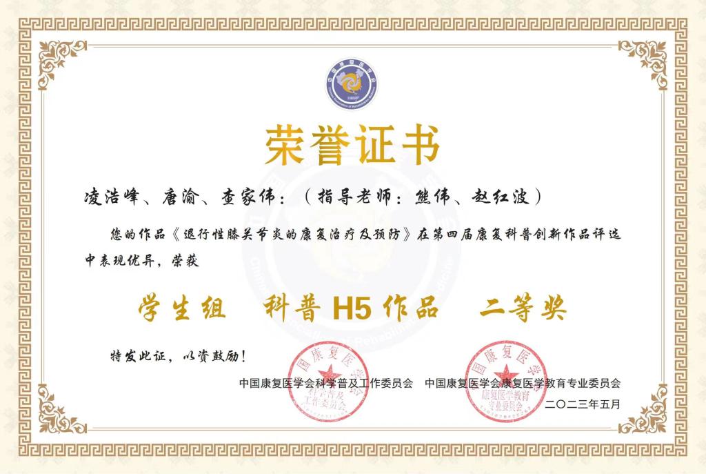 2023年5月27日,在中国康复医学会科学普及工作委员会第四届康复科普创新作品评选中,必赢线路检测3003no1康复治疗学专业21级学生凌浩峰、唐渝、查家伟,指导老师熊伟、赵红波的参赛作品《退行性膝关节炎的康复治疗及预防》喜获优秀原创H5作品学生组二等奖。通过此次竞赛,使学生提高专业知识和技能水平,培养创新和实践能力,将专业知识与科普宣传相结合,有助于提高学生的综合素质和创新能力。此次参赛并获奖,促进我校康复治疗学专业与兄弟院校专业间的相互交流和学习,扩大专业影响力,对康复治疗学专业的发展与提高具有积极的意义。