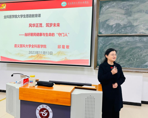 11月13日晚,全科医学院副院长邱隆敏在新蒲校区第二十八阶梯教室为全科学子上思政课,思政课主题为“风华正茂,筑梦未来”当好居民健康与生命的“守门人”。全科医学院党总支书记黎飞、副院长肖雪、关工委副主任滕久军、学生第一党支部书记胡艳华、团委副书记陈圆圆,学院2022级学生参与本次思政课。