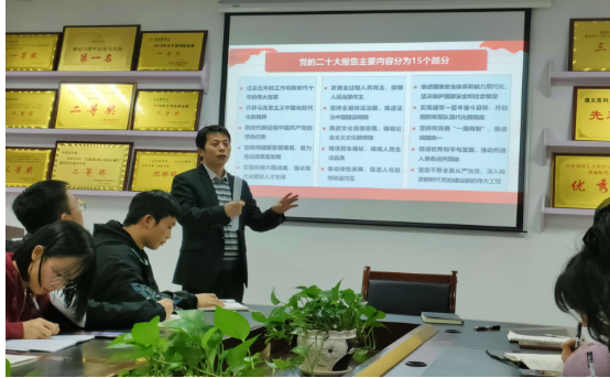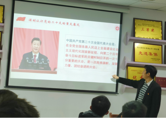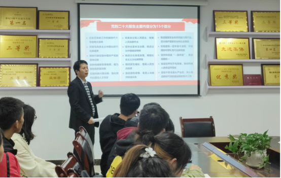 黎飞讲到,党的二十大是在全党全国各族人民迈上全面建设社会主义现代化国家新征程、向第二个百年奋斗目标进军的关键时刻召开的一次重要大会,同学们要深入学习贯彻党的二十大精神。他着重在医疗卫生领域、教育领域引导同学们学习大会报告中的相关内容,特别是报告中体现出的人民健康、健康中国战略、基层医疗等做了重点讲解,希望在座同学结合专业学习、结合自己的职业规划学习。