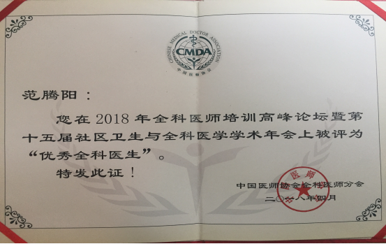 2018年全科医生范腾阳荣获中国医师协会“优秀全科医生”