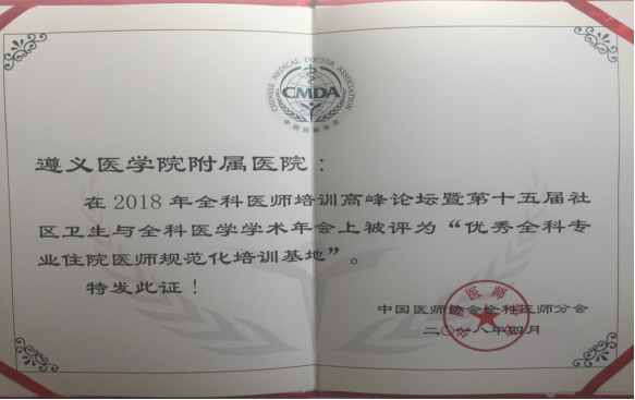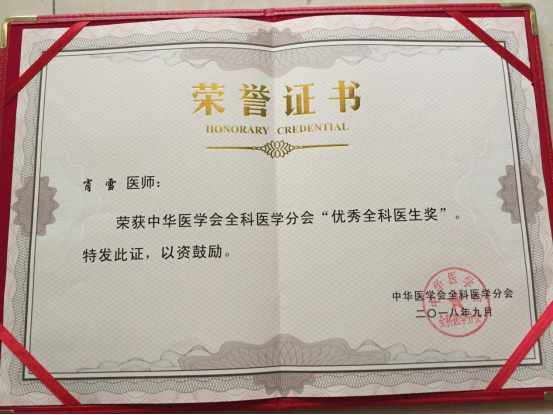 肖雪主任于2018年9月荣获中华医学会“优秀全科医生奖”