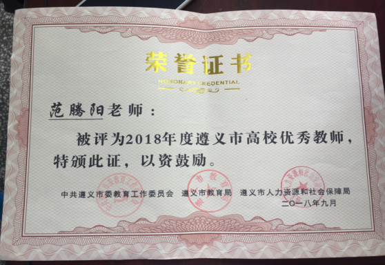 2018年全科医生范腾阳荣获“遵义市高校优秀教师”