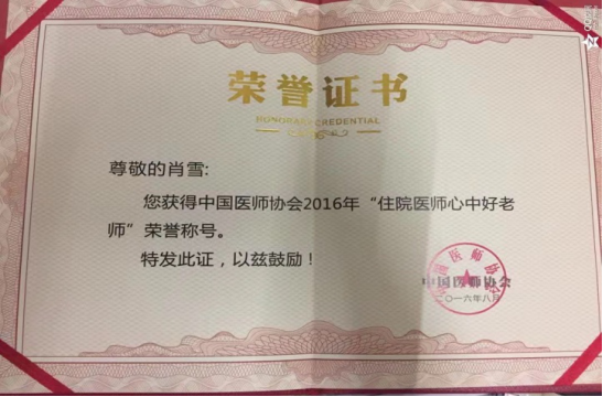肖雪主任于2016年8月荣获中国医师协会“住院医师心中好老师”