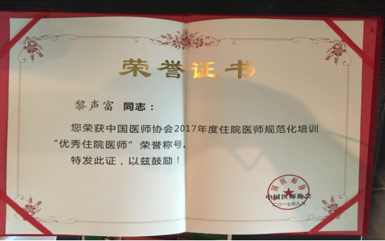 2015级学员黎声富于2017年荣获“优秀住院医师”