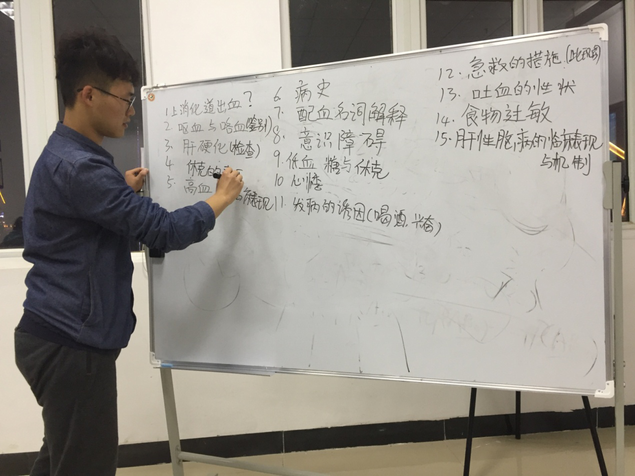 2016-2017学年第二学期2014级/2015级临床医学选修课程-PBL课程于2017.5.2-6.5期间完成所有教学,每周3学时、共计18学时,共开设四个教学组,每组8-9名学生,每组配备有临床学院和基础医学院各一位教师(tutor/co-tutor),为培养后备师资每组同时配有教学秘书1名。本学期PBL共学习两个教学团队成员的原创PBL案例,分别是一个由年轻患者因患易栓症引起的咯血案例-我为什么会咯血,另一个为老年患者因为肿瘤引起的消瘦-我怎么瘦了。案例初稿完成后经教学团队临床和基础的多位老师修改,并经集体备课反复讨论后定稿使用。