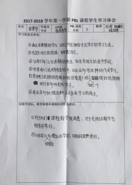 通过课程后期与学生的一对一交流及学生书面对课程、教师及教学案例的评价反馈,参加学习的学生对PBL课程和教学团队一致表示好评。学生均反映收获很大,通过PBL课程学习,自己发现问题、解决问题能力,沟通、交流能力,团队合作和协调能力,资料收集整理和规范书写、汇报表达等多方面得到锻炼。教学团队成员也通过PBL课程教学,教师需要改变以往的传统教学模式,作为一个引导者、观察者引导学生学习,注重培养学生自主学习能力、自己解决问题能力,对教师而言也是极大的教学能力的提高。